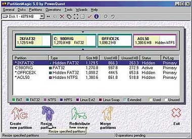 PartitionMagic версии 5.01 позволяет относительно безопасно создавать разделы на жестком диске, перемещать их, изменять размеры, скрывать и снова делать общедоступными. Например, создав дополнительный раздел для Windows 2000 (так же, как и для любой другой ОС), вы в дальнейшем можете безо всякого риска переходить от одной системы к другой.