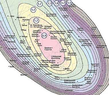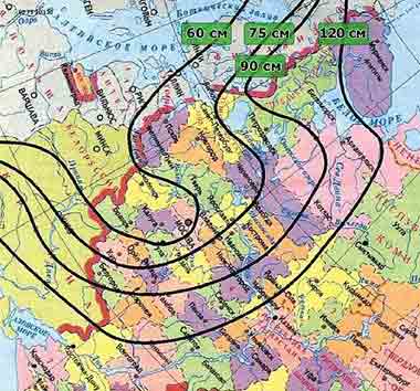 | Зоны устойчивого приема сигнала со спутника Intelsat 604 (цифрами показан размер антенны в метрах) |