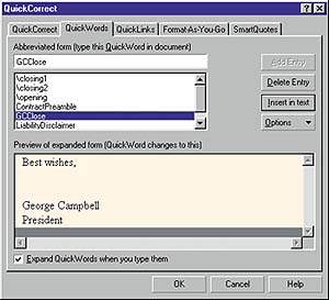 | Закладка QuickWords диалогового окна QuickCorrect редактора WordPerfect позволяет вставлять текст автоматически |