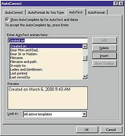 Word 97 и 2000. Чтобы вставить готовые элементы функции «Автотекст» (AutoText) — редактор Word предлагает множество таких элементов, — щелкните правой кнопкой мыши в любом свободном месте панели инструментов и в списке доступных инструментов выберите «Автотекст» (AutoText). Установите курсор в нужную позицию, отметьте расположенную на панели инструментов «Автотекст» кнопку «Все элементы» (All Entries), выберите категорию и нужный элемент. Можно также воспользоваться пунктом «Вставка?Автотекст» (Insert?AutoText), затем указать категорию и вставляемый элемент.