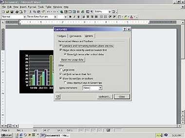 Чтобы отобразить полные меню в Word 2000 (или в любом другом приложении Office 2000, где есть ниспадающие меню), просто дважды, а не один раз, как обычно, щелкните мышью на заголовке меню. Если вы хотите, чтобы полное меню использовалось по умолчанию, выберите пункты «Сервис? Настройка» (Tools?Customize), перейдите к закладке «Параметры» (Options), а затем выключите опцию «В меню сначала отображаются последние использованные команды» (Menus show recently used commands first).
