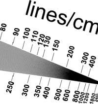 Полиграфические оригиналы обладают очень низким разрешением, равным линиатуре печати, — 80—175 линий на дюйм. Сканировать их с более высоким разрешением имеет смысл только тогда, когда необходимо подавить муар. В таком случае нужно отсканировать один и тот же оригинал в пакетном режиме с различными значениями разрешения и descreen, а затем выбрать наилучший вариант. Муар можно увидеть на экране монитора, если вывести изображение в натуральную величину. Начинающему специалисту трудно определить на глаз линиатру печати, поэтому лучше воспользоваться уголковой дифракционной решеткой. Ее обычно можно получить вместе с массой других полезных линеек и приспособлений в специальных сервисных бюро. При наложении такой решетки на оттиск возникают муаровые узоры, центры которых совпадают или кратны линиатуре полиграфического растра.