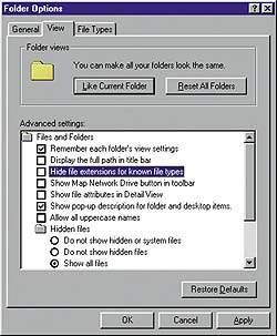 В списке названий файлов диалогового окна «Открытие документа» (Open) редакторов Word 97 или 2000 не всегда видны нестандартные расширения документов. Чтобы заставить Word отображать эти расширения, откройте Проводник, укажите пункты «Вид? Свойства папки» и в раскрывшемся диалоговом окне щелкните на закладке «Вид». В списке дополнительных настроек выключите функцию «Не показывать расширения для зарегистрированных типов файлов». Чтобы распространить это правило на все настройки ПК, выделите кнопку «Как у текущей папки», а потом «Да».