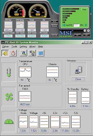 Перед установкой процессора нелишне будет нанести на контактную площадку кристалла специальную термопасту. Это позволит снизить рабочую температуру ЦП на 15—20%. Ну а любителям «разгонять» процессор рекомендуем активизировать в BIOS Setup (раздел «Мониторинг») опции отключения ПК в случае перегрева ЦП и системной платы. Не помешает также установить утилиту программного управления рабочими температурами системы, например SoftCool, которая поставляется сегодня с каждым продуктом компании MSI.