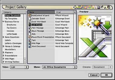 Общие шаблоны. После запуска какой-либо программы Office 2001 на экране появляется «Библиотека проектов» (Project Gallery), своего рода расширенный диалог «Открыть». В этом окне пользователь может создать пустой документ любого приложения Office либо выбрать в качестве основы будущего документа шаблон из обширной коллекции. Эта функциональная возможность Office 2001 «размывает» границы между программами, создавая ощущение, будто работа ведется в одном приложении. Соответственно экономится время.