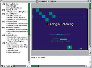 Новшества. Давайте посмотрим правде в глаза: многие из нас не продумывают презентации вплоть до запуска PowerPoint. Но планирование презентаций в PowerPoint 98 было занятием не из легких, поскольку их предварительный просмотр был ограничен структурой и заметками. PowerPoint 2001 предлагает окно документа, разбитое на три области, размеры которых можно изменять. Пользователь одновременно видит структуру, текущий слайд и заметки. Область для заметок, доступная пользователю во время создания презентации, подталкивает его к тому, чтобы эти заметки сделать заранее, вместо того, чтобы впопыхах писать их за час до лекции.