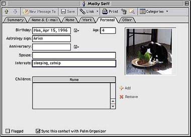Что стало лучше. Адресная книга Entourage больше других компонентов отличает эту программу от Outlook Express. Если почтовый клиент Microsoft имеет ограниченную по своим функциональным возможностям адресную книгу, то Entourage, напротив, предлагает полнофункциональный инструмент со всеми мыслимыми полями для ввода персональных данных (в адресную книгу можно поместить даже цифровое фото адресата) плюс набор пользовательских полей. Если же ваши клиенты или друзья тоже работают в Office 2001, присоедините свою контактную информацию к сообщению электронной почты и избавьте их от необходимости вводить ее вручную в их адресные книги.