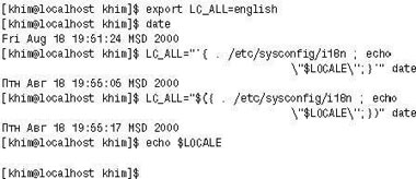 Взгляните на рис. 2. Здесь мы сначала заносим в переменную окружения LC_ALL, определяющую параметры страны, значение english, а затем выводим дату на языке страны, указанной в файле /etc/sysconfig/i18n (там задаются стандартные настройки системы). Чтобы это сделать, мы записываем в LC_ALL новое значение. Какое же?