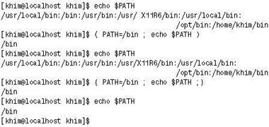 | Рис. 1. Если значение переменной окружения меняется внутри круглых скобок, на последующие команды это не влияет |