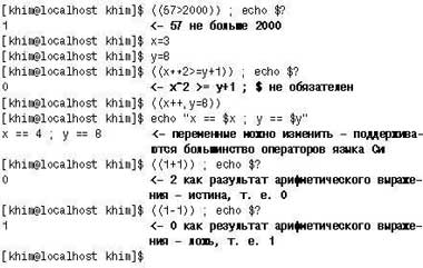 Любое арифметическое выражение также можно записать как команду и получить для него код возврата (рис. 6). Обратите внимание на два последних примера. Не кажется ли вам, что тут замешана какая-то мистика: 0 дает в результате 1, а 2 — 0? Дело в том, что внутри арифметических операторов действуют соглашения языка Си, т. е. истиной является любое число, кроме нуля, а ложью — нуль, вовне же поступает обычный код возврата, для которого все наоборот.