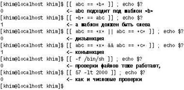 Самыми первыми появились команды test и [, различающиеся только тем, что [ для симметрии требует последним параметром символа ]. Эти команды предназначены в основном для проверки разнообразных условий, связанных со свойствами файлов. Сравнивать с их помощью строки тоже можно, хотя и не очень удобно (рис. 7). Лучше пользоваться более мощной командой [[: она допускает сравнение с шаблоном и предусматривает более мнемоническую запись конъюнкции и дизъюнкции (рис. 8).