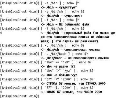 Проверки условий в bash... нет. Вернее, есть, но не в том виде, какой привычен нам по опыту работы в DOS. Ею занимаются специальные команды (в основном внутренние), каждая из которых проверяет определенный набор условий. Все они возвращают 0, если условие выполнено, и 1 в противном случае.