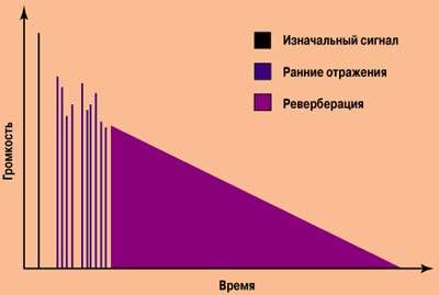 Кроме того, учитываются размеры помещения. В небольшом помещении, например маленькой каморке, отражения звуковых волн происходят очень часто и быстро переходят в реверберацию. Но в самолетном ангаре звук должен преодолеть значительное расстояние, прежде чем произойдет его столкновение с преградой (стенкой, потолком). Благодаря этому слушатель вначале отчетливо воспринимает ранние отражения, которые значительно разнесены по времени и только через определенный интервал переходят в реверберацию.
