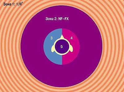 В стандарте позиционирования 3D-звука DirectSound3D (DirectSound3D — это часть функций интерфейса DirectSound, служащих для создания позиционируемого в трехмерном пространстве звука) предусмотрены три зоны: внешняя, дальнее поле и ближнее поле. В самой удаленной внешней зоне источники звука имеют постоянную интенсивность. В дальнем поле громкость источника изменяется по функции 1/Rn, где R — расстояние от слушателя. В ближнем поле интенсивность звукового сигнала постоянна и не зависит от расстояния до головы пользователя. Это сделано для того, чтобы, с одной стороны, уровень громкости не превысил допустимые границы и, с другой, чтобы уменьшить нагрузку на систему.