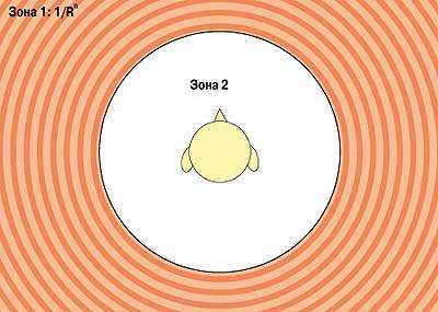 | Звуковые зоны, определяемые стандартом DirectX: зона 1 — дальнее поле, где интенсивность звука обратно пропорциональна расстоянию, зона 2 — ближнее поле, где громкость звука постоянна (внешняя зона не показана) |