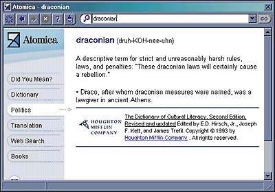 Бывало ли с вами так, что требуется срочно выяснить значение незнакомого слова, а словаря под рукой нет? Электронный словарь Atomica for Windows выдает толкования слов, появляющихся в любой Windows-программе, будь то почтовый клиент, Web-браузер, текстовый процессор или что бы то ни было другое. Достаточно щелкнуть на интересующем вас слове, удерживая нажатой кнопку , — и толкование появляется на экране. Загружаемый файл занимает всего 945 Кбайт, а информация берется из поддерживаемой компанией Atomica (ранее — GuruNet) обширной базы знаний, включающей энциклопедии и словари, а также из некоторых других источников в Web. Единственный недостаток программы в том, что ею можно пользоваться, только будучи подключенным к Internet.