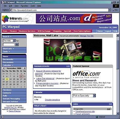Корпоративные intranet-сети представляют собой замечательное средство организации внутренних коммуникаций, помогающее держать всех сотрудников в курсе дел компании и эффективно снабжать их информацией. Сервер Intranets.com раздает даром intranet-сети вместе с календарем для составления индивидуальных и групповых графиков, а также утилитой для управления совместным доступом к файлам, сообщающей, кто последним работал над данным документом. Вы настраиваете для защищенного паролем сайта учетную запись администратора, а после этого добавляете каких угодно рядовых пользователей. Сотрудники могут помещать объявления на главную страницу intranet-сайта, обсуждать различные вопросы с другими членами своих рабочих групп в форумах, поддерживающих дискуссионные «нити», параллельно голосовать по проектам и предложениям в секции анкетирования и даже пользоваться внутренней службой немедленной доставки сообщений.