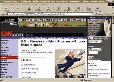 Несколько лет назад японец Тоехиро Акияма провел целых семь дней на космическом корабле «Союз-ТМ11». За это японская сторона заплатила 25 млн. долл., положив тем самым начало космическому туризму. В самое ближайшее время на околоземной орбите окажется, видимо, и американский миллионер Денис Тито, который сквозь годы пронес мечту о космосе, — в молодости он работал в НАСА. Такой полет обойдется ему в 20 млн. долл. Более подробную информацию об этом можно найти на Web-странице телекомпании СNN по адресу: http://www.cnn.com/2000/ TECH/space/11/27/russia.spacetourist.ap/index.html.