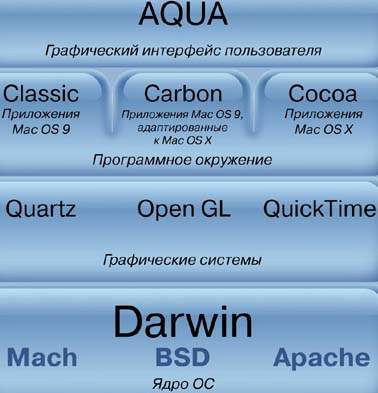 Так называемое ядро составляет основу любой операционной системы, это — святая святых, компонент, ответственный за организацию работы аппаратных средств, файловой системы, базовых систем ввода-вывода, обеспечивающий на самом низком уровне работу приложений (например, выделяющий им память). Ядро Mac OS X, которому разработчики дали название Дарвин (Darwin), представляет собой одну из версий UNIX, приспособленную для работы на аппаратной платформе Apple — процессорах PowerPC G3, G4 и некоторых системах на PowerPC 604.