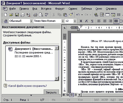 Во все приложения Office XP встроена функция аварийного сохранения результатов работы. Так, если какая-либо программа «падает», то все документы, с которыми пользователь работал в этой программе, автоматически сохраняются в текущем состоянии. Пользователю выводится диалоговое окно с предложением отправить в Microsoft отчет о происшедшем, а также перезапустить программу, совершившую ошибку. При перезапуске программы все открытые в ней на момент «краха» документы восстанавливаются и их список предлагается пользователю в Области задач вместе с краткой информацией о каждом из них (рис.9).