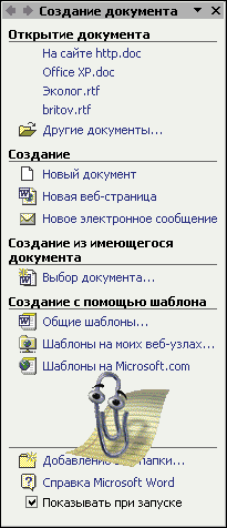 | Рис.3. Область задач: окно «Создание документа» |