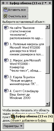Одно из окон Области задач — это буфер обмена, в котором могут помещаться до 24 фрагментов текста или изображений, причем скопированных или вырезанных не только из Microsoft Office, но и из любого другого приложения. Для вставки нужного фрагмента достаточно дважды щелкнуть мышью на нужном фрагменте. В окне просмотра буфера обмена отображаются первые строчки фрагментов текста или уменьшенные копии изображений (рис.4), и это очень облегчает работу.