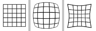 | Слева исходное изображение. В результате бочкообразной (в центре) и подушкообразной (справа) дисторсии картинка искажается |