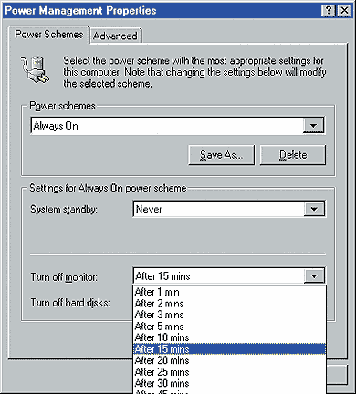 На самом деле использование хранителя экрана может даже укоротить срок службы монитора. Наиболее уязвимый компонент цветных дисплеев — электронная пушка, которая управляет пучками лучей, вызывающих свечение экрана. И лучший способ продлить срок ее жизни — просто отключать неработающий монитор. А если вам лень делать это вручную всякий раз, когда вы отходите от стола, то предоставьте Windows 98 отключать монитор. Для этого надо открыть утилиту «Управление электропитанием», расположенную на Панели управления, и щелкнуть на закладке «Схемы управления электропитанием».