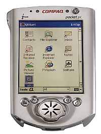 Компании Compaq удался небольшой шедевр (130x83,5x15,9 мм) — iPAQ. Хотя его размеры не так уж малы, но четкий экран с сочными цветами оставляет приятное впечатление. К сожалению, картинка отображается в 12-битовом режиме (4096 цветов). При том что модель несколько великовата, удачный выбор задач, «повешенных» на кнопки «горячего» запуска, и возможность использовать джойстик для навигации делают работу с ним очень удобной. Наиболее популярны модификации 3630 и 3660 с 32- и 64(!)-Мбайт ОЗУ. Большой ли объем памяти, быстрый ли 206-МГц процессор StrongArm фирмы Intel, но этот КПК стал самым популярным среди устройств под управлением Windows CE и попал в «Книгу рекордов Гиннесса» как самое мощное персональное устройство. Из очевидных достоинств еще можно отметить флэш-ПЗУ, допускающее обновление ОС.