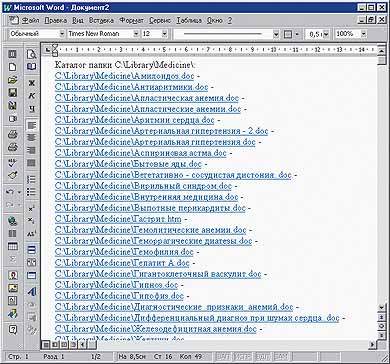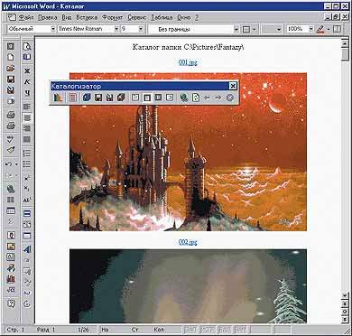 Программа «Каталогизатор» вставляет в документ, открытый в Word, список из гиперссылок на все или какие-либо определенные файлы в заданной пользователем папке (рис. 5). При этом можно сортировать файлы, а также вставлять после каждой ссылки на картинку в формате Gif или Jpeg эту самую картинку.