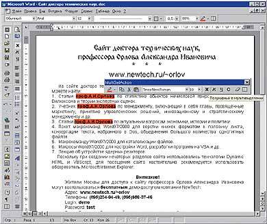 Ознакомиться с творениями Михаила Гладченко рекомендуется всем, кто интересуется возможностями VBA по работе с текстом. Переписать MultiSelAction можно из «Библиотеки Microsoft Office Extensions» со страницы http://www.microsoft.ru/offext/a.asp.