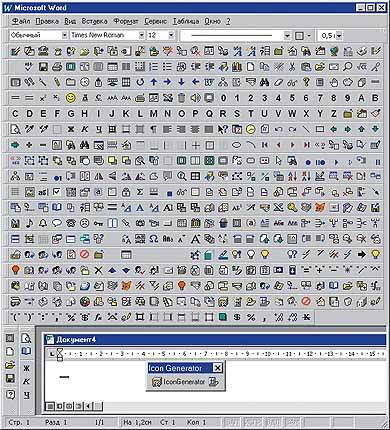 Часто с ростом опыта у пользователя возникает желание как-нибудь переделать привычные программы и настроить их под свои требования. Особенно хорошо поддается такому преобразованию Microsoft Word: его гибкая система настройки панелей и меню предоставляет множество дополнительных возможностей. Однако при добавлении новых команд на Панели инструментов Word часто хочется сделать их красивыми, присвоив им разноцветные значки. Но стандартный набор значков, предоставляемый редактором Word, не слишком-то и велик… Эту проблему успешно решает программа Icon Generator («Генератор иконок»). Впрочем, ее правильнее было бы называть «Вытаскиватель иконок». Дело в том, что в исполняемых файлах и библиотеках Word содержится около 3000 значков. Эти значки по умолчанию назначены разным командам, большую часть которых обычный пользователь никогда не вызывает по причине ненадобности или отсутствия информации о них. Но это вовсе не значит, что значки команд нельзя использовать для своих целей. Программа Icon Generator извлечет из недр Word такие значки и разместит на специально созданных панелях инструментов, так что вам останется лишь скопировать их на свои панели с помощью стандартной функции «Копировать значок» (рис. 7) режима настройки панелей.