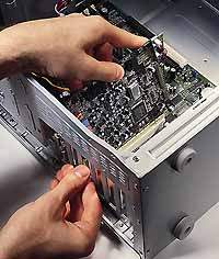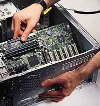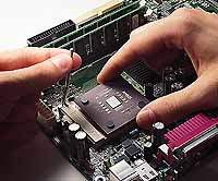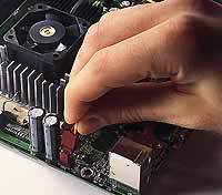 Теперь пора проверить системную плату, ЦП и ОЗУ. Вставьте графическую плату в AGP-разъем, закрепите ее винтом, подсоедините монитор, клавиатуру и мышь. Подключите кабель питания к разъему на задней панели корпуса и к сети напряжения, Включите ПК. Если вы услышите один звуковой сигнал и увидите на экране информацию о BIOS, то, значит, основные компоненты компьютера работают так, как нужно. Отключите ПК от сети питания и продолжайте работать в той последовательности, что приведена ниже.