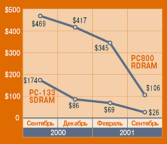 Средняя цена 128-Мбайт модуля памяти РС-133 SDRAM — 26 долл. (см. график), а модуля DDR — 34 долл. (Кстати, сейчас в России цены на эти продукты несколько ниже. — Прим. ред.). Даже модуль RDRAM того же объема обойдется в 106 долл., поэтому нет смысла жадничать и откладывать покупку. Хотя пользователей устраивают такие цены, производители придерживаются иного мнения и жаждут вернуть соотношение спроса и предложения к прежнему уровню (следовательно, и цены. — Прим. ред.).