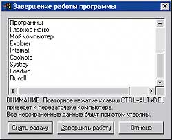 Почти каждому пользователю приходилось прибегать к услугам диалогового окна «Завершение работы программы», вызываемому комбинацией клавиш + + (рис. 6). Это бывает необходимо тогда, когда какая-либо программа так зависает, что реанимировать ее уже невозможно. Но, к сожалению, в этом окне заложены ограниченные и слабые функции, и потому далеко не всегда удается выгрузить зависшую программу. Так что для просмотра процессов системы имеет смысл прибегнуть к помощи специальных программ, например к утилите Process Viewer, разработанной Игорем Нисом (рис. 7), или CCTask, созданной Алексом Рассом (рис. 8).