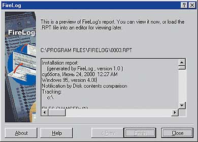 Эта утилита, созданная Дмитрием Дементьевым, должна быть у каждого опытного пользователя. Она предназначена для исследования деятельности инсталляторов, т. е. тех программ, которые предназначены для установки в систему других программных продуктов (работает в Windows 9х и 2000). FireLog позволяет внимательно проследить за всеми действиями программы-установщика и выяснить, какие файлы были добавлены или изменены, какие ключи Реестра появились или обновились. Например, она помогает отслеживать появление ненужных или временных файлов, что весьма важно для соблюдения порядка на жестком диске.