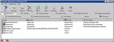 Эти места желательно регулярно просматривать, чтобы узнать, не появились ли там лишние записи, сделанные вирусами-троянами. (Есть, правда, еще и пятое место для автозапуска программ — раздел Реестра с указателями на так называемые «виртуальные драйверы» — HKEY_LOCAL_MACHINESystemCurrentControlSet ServicesVxD, который, в частности, использует комплект программ Norton Utilities для запуска своих компонентов. Однако вредоносные программы размещаются в этом месте довольно редко, видимо, из-за сложности написания полноценного виртуального драйвера.) Постоянно «лазить» по Реестру и системным файлам не так уж и удобно. Чтобы облегчить данный процесс, и была создана программа Starter, предназначенная для отображения и управления списком приложений, автоматически запускающихся при загрузке Windows. К ее достоинствам относятся хорошо продуманный интерфейс и привлекательный дизайн (рис. 9).