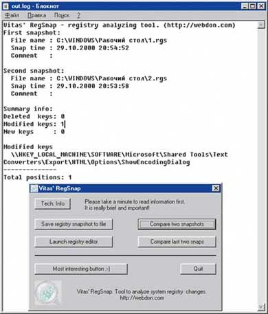 В принципе тот же самый результат можно получить, если экспортировать Реестр в текстовый файл до начала функционирования исследуемой программы и по ее завершении, а потом сравнить получившиеся текстовые файлы в Norton Commander или в любой другой программе, имеющей функцию сравнения файлов, однако работать с RegSnap все же удобнее.