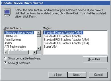 - Удалите все драйверы старого устройства. Нажмите кнопку «Пуск» и укажите пункты «Настройка?Панель управления?Система», потом «Устройства», дважды щелкните на нужной категории, выберите тот компонент, который вы снимаете, и щелкните на кнопке «Удалить». Замечание: чтобы убрать драйвер видеоадаптера, сперва дважды щелкните на имени устройства, затем на закладке «Драйвер» и после этого нажмите кнопку «Обновить драйвер». Теперь с помощью программы-мастера обновления драйвера установите стандартный VGA-драйвер Windows (см. рисунок).