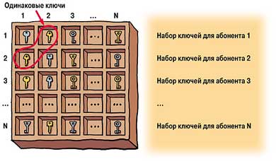 Однако, несмотря на неудобство передачи ключей, есть и программы, позволяющие симметрично шифровать информацию именно для передачи через Интернет. Обычно они бывают востребованы там, где информация исключительно секретна, и пользователи подобных систем жертвуют удобством ради повышенной безопасности. Предположим, что вы общаетесь по защищенной электронной почте с тремя пользователями. В этом случае не стоит задействовать один ключ — если кто-либо из ваших адресатов его упустит, вся переписка окажется под угрозой вскрытия. Чаще всего при таком шифровании предпочитают сетевые наборы. Каждый набор принадлежит одному из пользователей и содержит несколько ключей для его связи с любым из остальных. То есть для того чтобы дать злоумышленнику прочитать всю свою переписку, нужно умудриться потерять полностью сетевой набор. Для простоты понимания совокупность сетевых наборов представляют обычно в виде матрицы, каждая строка которой содержит набор ключей одного из пользователей всей системы шифрования.