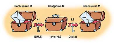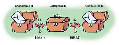 Здесь D — алгоритм расшифрования, которым ваш адресат обрабатывает сообщение C с целью получить посланное ему сообщение M. Если система построена верно и ключи не перепутаны (кстати, ключ k2 может быть и не равен ключу k1, но об этом позже), то адресат примет именно то, что вы передали. При этом никто другой не сможет это сообщение подсмотреть, поскольку по Интернету оно пересылается в виде нечитаемой шифровки.