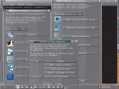 Для настройки маршрутизации нужно определить адрес, сетевую маску и IP-адрес шлюза, через который пакет дойдет до адресата. Для этого можно пользоваться стандартной утилитой linuxconf, а точнее ее частью netconf. Раздел Routing and gateways (маршрутизация и шлюзы) позволяет настроить все, что связано с маршрутизацией. Впрочем, можно воспользоваться и текстовыми утилитами ifconfig для настройки сетевых интерфейсов и утилитой route для изучения и изменения таблиц маршрутизации.