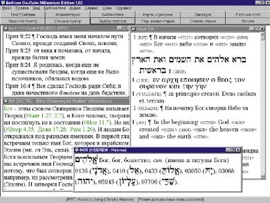 Справа: программа показывает друг под другом разные тексты самого первого стиха Библии (русский, еврейский, греческий, латинский, украинский, английский). Всего на диске Online Bible более 75 текстов Св.Писания на 29 языках, при этом абсолютное большинство можно скопировать бесплатно из Интернета. Вверху слева: к первому стиху Библии найдено 78 стихов аналогичной тематики (параллельные места). При традиционной работе это значило бы 78 закладок в книге... Внизу слева: при щелчке по слову «Бог» появляется его толкование из библейского словаря. Если щелкнуть по ссылкам, выделенным цветом, программа покажет эти стихи в отдельном окне. Внизу справа: по номеру конкорданции 430 программа нашла, какое слово было в еврейском тексте на месте русского «Бог».