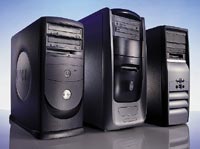 | Системы на основе новейшей версии процессора Pentium 4 компании Intel (слева направо): Dell Dimension 8200, HP Pavilion 9905 и Compaq Evo D300 |