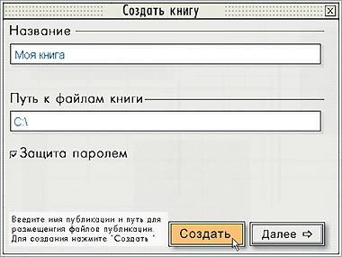 В поле «Название» этого окна следует ввести произвольное имя или оставить предлагаемое по умолчанию, а в поле «Путь к файлам книги» задать адрес папки, где будут размещаться публикации всех файлов. Установка флажка «Защита паролем» позволит конвертировать документ с последующей защитой от несанкционированного доступа.
