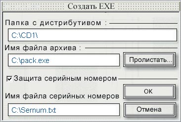 Чтобы сэкономить место, программа допускает автоматическое создание самораспаковывающегося архивированного файла на основе дистрибутива. Щелчком на кнопке Exe-файл на экран выводится диалоговое окно «Создать EXE» (рис. 5).