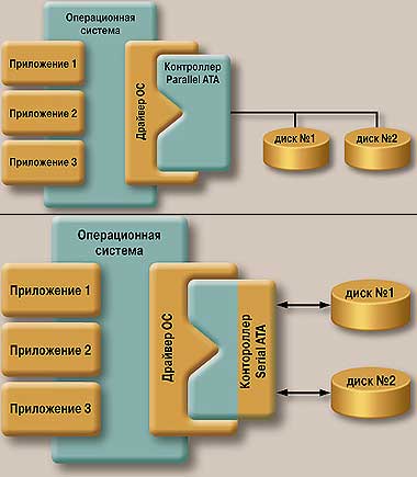 | Рис. 2. Интерфейс Serial ATA отличается тем, что у каждого «винчестера» - собственная шина |