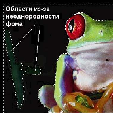 Щелкните левой кнопкой мыши рядом с лягушонком. Практически весь фон попадает в выделенную область, так как он имеет ровный черный цвет, резко контрастирующий с зеленым цветом самого лягушонка. Однако цвет под изображением не вполне однороден, и поэтому на нем остались неохваченными несколько небольших фрагментов (рис. 3). Чтобы устранить эти участки, нажмите клавишу и, не отпуская ее, щелкните мышью внутри них. Затем отпустите . Теперь весь фон выделен.