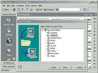 В Outlook укажите «Файл?Импорт и экспорт». На первой странице Мастера импорта и экспорта выберите опцию «Экспорт в файл», на следующей — «Значения, разделенные запятыми (Windows)». Мастер может попросить вас установить отсутствующую функцию. Если это случится, то вам потребуется компакт-диск с дистрибутивом Office. На третьей странице Мастера изберите «Контакты», на четвертой укажите имя файла, а на пятой щелкните на кнопке «Готово».
