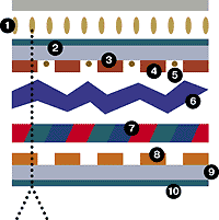Устройство современного OLED-элемента 1.Металлический катод 2.Промежуточный слой 3.Слой n-материала — донор электронов 4.Cлой p-материала — донор «дырок» 5.Слой p-материала 6.Промежуточный слой 7.Органический слой, в котором происходит рекомбинация заряда, и куда добавляется небольшое количество молекул флюоресцирующих соединений 8.Примеси, входящие в состав n-материала и обеспечивающие соответствующий цвет испускаемого элементом света 9.Прозрачный анод 10.Стекло 11.Тонкопленочные транзисторы (TFT, thin film transistors), управляют уровнем яркости каждой точки матрицы |